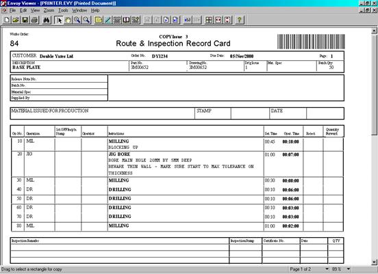 Once Manufacturing Instructions are available the User may print off Route Cards for that Part in either stand-alone format or via the Works Order and Scheduling modules which will enable the Route Card to automatically reflect the Customer, Quantity, Due Date, Works Order Number, etc.